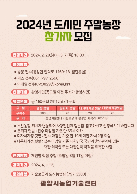 ´Ù¸¸, ´ë»óÀÚ ¼±Á¤Àº ÀÛ³â°ú ´Ù¸£°Ô 2024³â ½Å±Ô½ÅûÀÚ¸¦ ¿ì¼± ¹èÁ¤Çϰí, 2023³â ÁÖ¸»³óÀå ÀÌ¿ëÀÚ´Â ÈļøÀ§·Î ¹èÁ¤ÇÒ °èȹÀ̰í, ±âŸ ÀÚ¼¼ÇÑ »çÇ×Àº ±¤¾ç½Ãû ȨÆäÀÌÁö °ø°í¸¦ Âü°íÇÏ¸é µÈ´Ù.