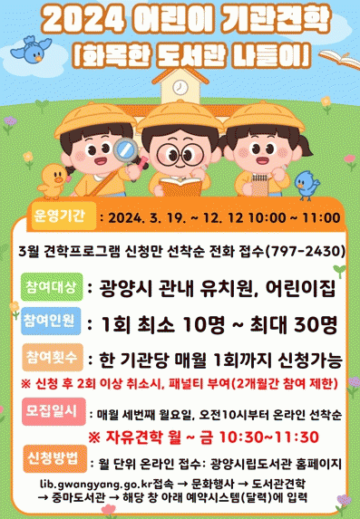 2024³âµµ ÇÁ·Î±×·¥Àº ¿À´Â 3¿ù 19ÀϺÎÅÍ 12¿ù 12ÀϱîÁö ¿î¿µµÇ¸ç, ¹æÇÐ ±â°£ÀÎ 8¿ùÀ» Á¦¿ÜÇÑ ¸ÅÁÖ È, ¸ñ(2ȸ) ¿ÀÀü 10½ÃºÎÅÍ 1½Ã°£ µ¿¾È ÁøÇàµÈ´Ù.