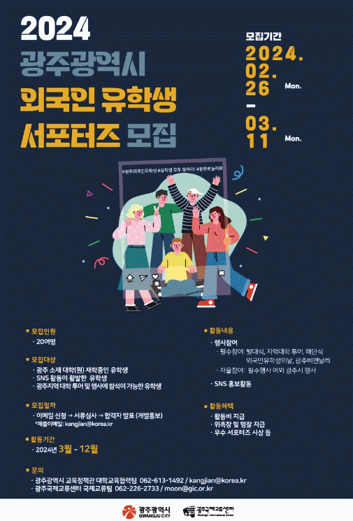 ¿Ü±¹ÀÎ À¯Çлý ¼Æ÷ÅÍÁî¿¡ ¼±Á¤µÇ¸é ±¤Áֽá¤Áö¿ª´ëÇÐ È«º¸Çà»ç¿¡ Âü¿©ÇÑ Èı⳪ ±¤ÁÖ¿¡¼ÀÇ À¯ÇлýȰ µîÀ» »çȸ°ü°è¸Á¼ºñ½º(SNS)¸¦ Ȱ¿ëÇØ È«º¸È°µ¿À» ÆîÄ¡°Ô µÈ´Ù.