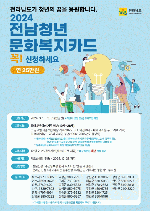¡®Àü³²Ã»³â ¹®Èº¹ÁöÄ«µå Áö¿ø»ç¾÷¡¯Àº û³âÀÇ ¹®È ÇâÀ¯¿Í Àڱ⠹ßÀü ±âȸ¸¦ Á¦°øÇϱâ À§ÇÑ ¹®Èº¹Áöºñ Áö¿ø»ç¾÷À¸·Î 2024³âºÎÅÍ´Â 5¸¸ ¿øÀÌ Áõ¾×µÈ ¿¬ ÃÖ´ë 25¸¸ ¿øÀÌ Áö¿øµÈ´Ù.
