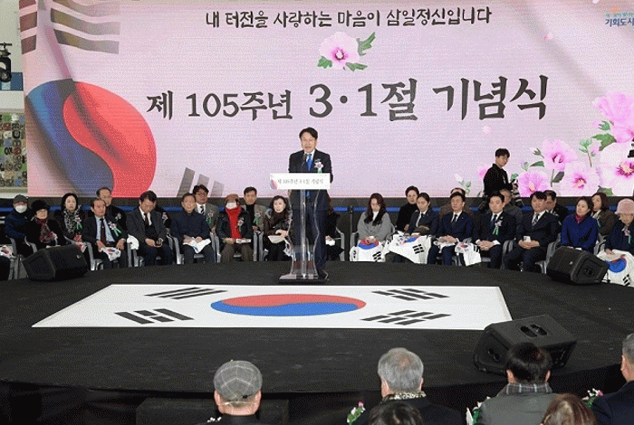 ° ½ÃÀåÀº ±â³ä»ç¿¡¼ ¡°105³â Àü ¿À´ÃÀº Æò¹üÇÑ ¿ì¸®°¡ ´ëÇÑÀÇ µ¶¸³À» ¼±¾ðÇÑ ³¯ÀÌ´Ù¡±¸ç ¡°»ç¶ûÇÏ´Â ÅÍÀüÀ» µÇã±â À§ÇØ µ· ÀÖ´Â »ç¶÷Àº µ·À» ³»¾î µ¶¸³¿îµ¿À» Áö¿øÇß°í, ÁöÇýÀÖ´Â »ç¶÷Àº ÁöÇý¸¦ ³»¾î ½Å¹®À¸·Î, ½Ã·Î, ¼±¾ð¹®À¸·Î µ¶¸³ÀÇ ´çÀ§¸¦ ¾Ë·ÈÀ¸¸ç, ¹ÎÁßÀº ¿ë±â¸¦ ³»¾î ¸öÀ¸·Î Ç×°ÅÇß´Ù¡±°í ¸»Çß´Ù.