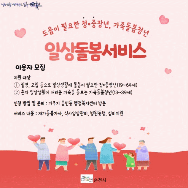 Àϻ󵹺½ ¼ºñ½º´Â È¥ÀÚ¼ ÀÏ»ó»ýȰÀ» ¼öÇàÇϱ⠾î·Á¿î û¡¤ÁßÀå³â(19~64¼¼)°ú °¡Á·µ¹º½Ã»³â(13~39¼¼)ÀÇ »îÀÇ ÁúÀ» ³ôÀ̱â À§ÇØ Àç°¡ µ¹º½¼ºñ½º¿Í º´¿øµ¿Çà, ½É¸®Áö¿ø, ½Ä»çÁö¿ø µîÀ» ÅëÇÕÀûÀ¸·Î Á¦°øÇÏ´Â ¼ºñ½º´Ù.