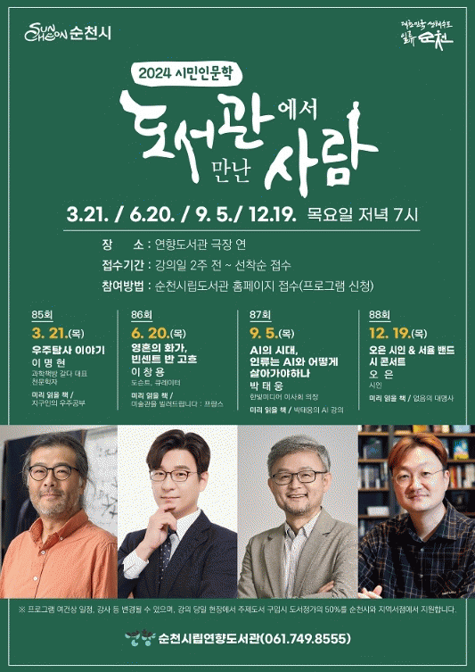 ÇÑÆí, ½Ã¹ÎÀι®ÇÐ °Á´ 3¿ù À̸íÇö õ¹®ÇÐÀÚ¸¦ ½ÃÀÛÀ¸·Î 6¿ù 20ÀÏ ÀÌâ¿ë µµ½¼Æ®ÀÇ¡®¿µÈ¥ÀÇ È°¡, ºó¼¾Æ® ¹Ý °íÈ塯, 9¿ù 5ÀÏ ¹ÚÅ¿õ ÇѺû¹Ìµð¾îÀÌ»çȸ ÀÇÀåÀÇ ¡®AI½Ã´ë, Àηù´Â AI¿Í ¾î¶»°Ô »ì¾Æ°¡¾ßÇϳª¡¯°Àǰ¡ À̾îÁö¸ç, 12¿ù 19ÀÏ ¿ÀÀº ½ÃÀΰú ¼À²¹êµå°¡ ÇÔ²²ÇÏ´Â ½Ã ÄܼƮ·Î 2024³â ½Ã¹Î Àι®ÇÐÀ» ¸¶¹«¸®ÇÒ ¿¹Á¤ÀÌ´Ù.