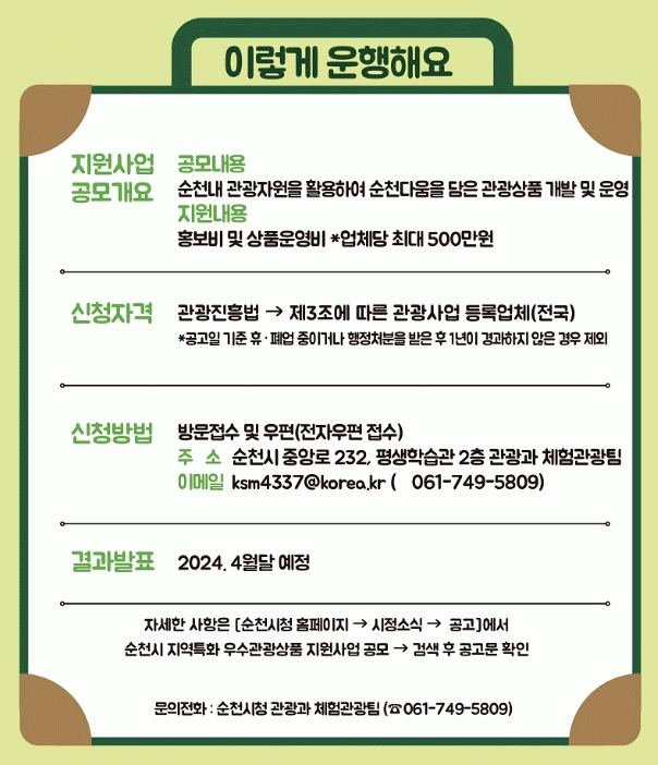 À̹ø °ø¸ð»ç¾÷Àº ¼øÃµ °ü±¤ÀÇ Âü½ÅÇÑ À̹ÌÁö ±¸Ãà°ú »õ·Î¿î º¯È¸¦ À̲ø¾î ³»±â À§ÇÑ »ç¾÷ÀÌ´Ù.