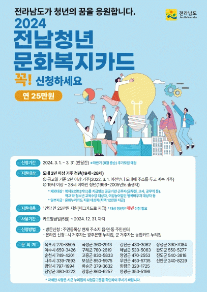 °ø¿¬ °ü¶÷, Çпø ¼ö°, µµ¼ ±¸ÀÔ µî û³âÀÇ ¹®È»ýȰ ÇâÀ¯ ¹× ÀÚ±â°è¹ß ±âȸ Á¦°øÀ» À§ÇÑ Áö¿ø»ç¾÷Àº, ½ÅûÀÏ ÇöÀç 2³â ÀÌ»ó Àü³²¿¡ °ÅÁÖÇϰí ÀÖ´Â 19~28¼¼°¡ Âü¿©ÇÒ ¼ö ÀÖ°í, ¿¬ 25¸¸¿øÀÇ ¹®Èº¹Áöºñ¸¦ Áö¿øÇÏ´Â ³»¿ë.
