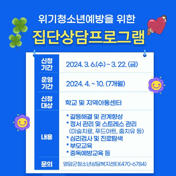 ÃÊ¡¤Áß¡¤°í±³¿Í Áö¿ª¿µ¾Æµ¿¼¾ÅÍ µî û¼Ò³â±â°üÀÌ ½ÅûÇÒ ¼ö ÀÖ´Â À̹ø Áý´ÜÇÁ·Î±×·¥Àº, °¥µîÇØ°á ¹× °ü°èÇâ»ó, Á¤¼°ü¸® ¹× ½ºÆ®·¹½º Á¶Àý, ½É¸®°Ë»ç ¹× Áø·ÎŽ»ö µî ÃÑ 16°³ °ú¸ñÀ¸·Î ±¸¼ºµÅÀÖ´Ù.