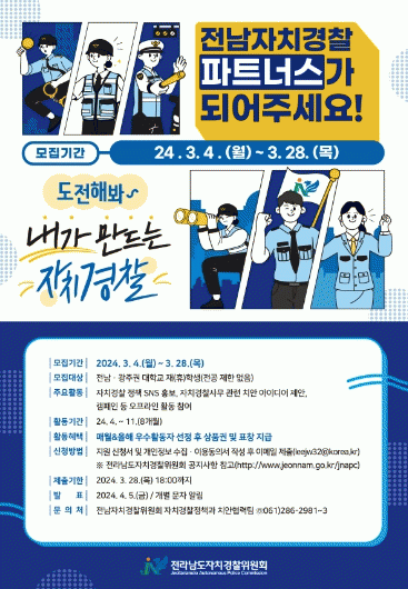 ÀÚÄ¡°æÂû¿¡ °ü½ÉÀÌ ¸¹°í È«º¸È°µ¿¿¡ Àû±ØÀûÀÎ ±¤ÁÖ¡¤Àü³² ´ëÇлýÀÌ¸é °³ÀÎ ¶Ç´Â ÆÀÀ» ±¸¼ºÇØ ´©±¸³ª Áö¿øÇÒ ¼ö ÀÖ´Ù. ½ÅûÀº Àü³²ÀÚÄ¡°æÂûÀ§¿øÈ¸ ´©¸®Áý¿¡ Á¢¼ÓÇØ ¿Â¶óÀÎ ½Åû¼¸¦ ÀÛ¼ºÇÑ ÈÄ À̸ÞÀÏ·Î Á¦ÃâÇÏ¸é µÈ´Ù.