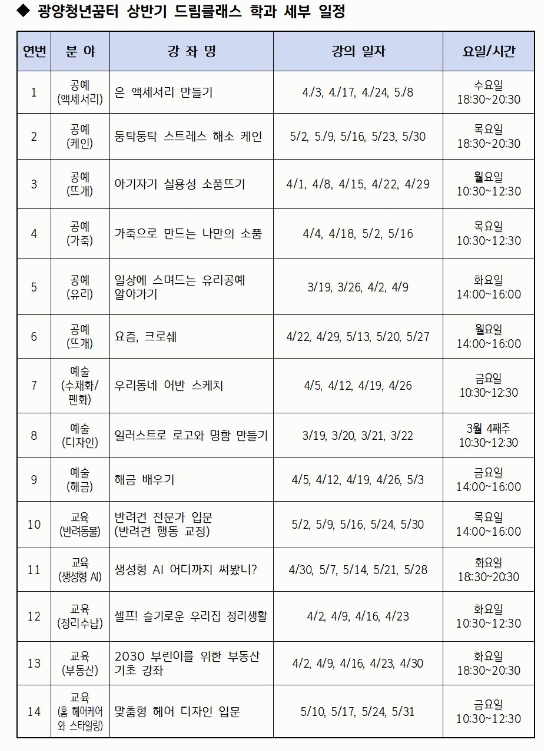 ÇÁ·Î±×·¥Àº ¡ã°ø¿¹(Àº ¾×¼¼¼¸® ¸¸µé±â, ¼Òǰ ¶ß±â, À¯¸®°ø¿¹ µî) ¡ã¿¹¼ú(¼öäÈ, ÀÏ·¯½ºÆ® µðÀÚÀÎ, ÇØ±Ý ¿¬ÁÖ µî) ¡ã±³À°(ºÎµ¿»ê, Á¤¸®¼ö³³, ¹Ý·Á°ß Àü¹®°¡ ÀÔ¹® µî) ºÐ¾ß 14°³ Çаú·Î ¿À´Â 19ÀϺÎÅÍ 5¿ù 31ÀϱîÁö ±¤¾çû³â²ÞÅÍ¿¡¼ ¿î¿µµÉ ¿¹Á¤ÀÌ´Ù.