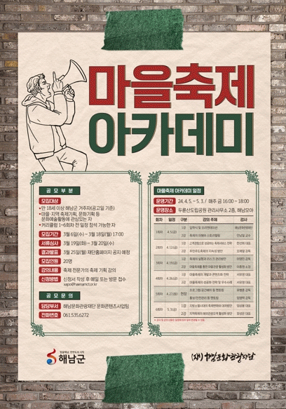 ¸¶À»ÃàÁ¦¿¡ °ü½ÉÀÖ´Â ÇØ³²±º¹ÎÀ̶ó¸é ´©±¸³ª Âü¿© °¡´ÉÇϸç, µÎ·û»êµµ¸³°ø¿ø °ü¸®»ç¹«¼Ò 2Ãþ ÇØ³²¸ð¾Æ¿¡¼ ¸ÅÁÖ ±Ý¿äÀÏ, ÃÑ 10ȸ¿¡ °ÉÃÄ ±³À°°ú À¾¸é ÃàÁ¦ ÇöÀå ¸ð´ÏÅ͸µÀ» ÁøÇàÇÒ ¿¹Á¤ÀÌ´Ù.