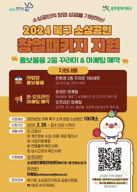 Áö¿ø ´ë»óÀº 2023³â 1¿ù 1ÀÏ ÀÌÈÄ ºÏ±¸ Áö¿ª¿¡ â¾÷ÇÑ ¼Ò»ó°øÀÎ 100°³ »ç¾÷ÀåÀ̰í Âü¿©¸¦ Èñ¸ÁÇÏ´Â ¼Ò»ó°øÀÎÀº ºÏ±¸Ã» ´©¸®Áý ¼ÒÅ뱤Àå¿¡ °Ô½ÃµÈ »ç¾÷ °ø°í¹®À» È®ÀÎÇÏ¿© ½Åû¼¿Í ±¸ºñ¼·ù¸¦ ¼Ò»ó°øÀÎÁ¾Çվȳ»¼¾ÅÍ(ºÏ±¸Ã» 1Ãþ) ¹æ¹® ¶Ç´Â À̸ÞÀÏÀÇ ¹æ¹ýÀ¸·Î ¼±Âø¼ø Á¦ÃâÇÏ¸é µÈ´Ù.