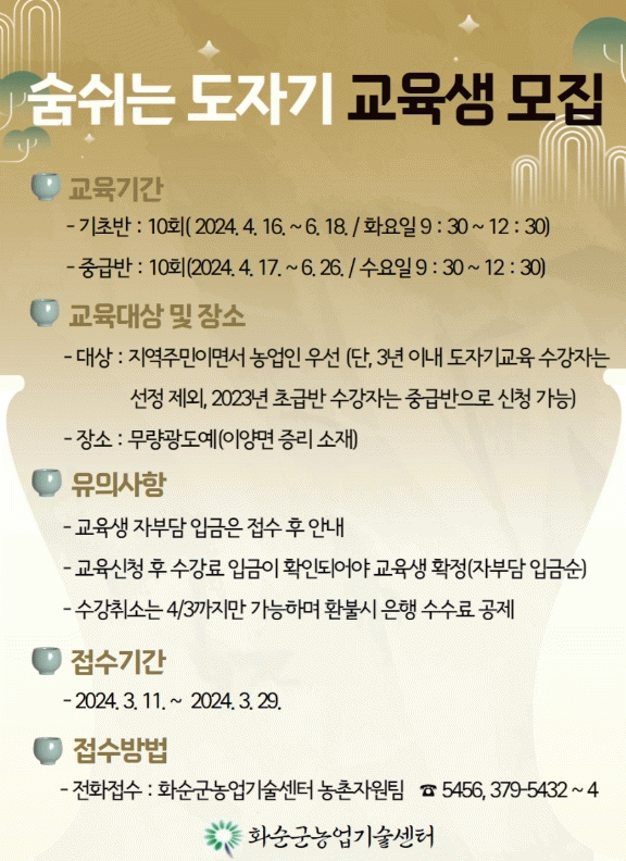 °úÁ¤º° ¸ðÁý Á¤¿øÀº 12¸í¾¿ÀÌ¸ç ±³À° ½ÅûÀº 3¿ù 11ÀϺÎÅÍ ³ó¾÷±â¼ú¼¾ÅÍ ³óÃÌÀÚ¿øÆÀÀ» ¹æ¹®Çϰųª ÀüÈ·Î ½ÅûÇÏ¸é µÈ´Ù.