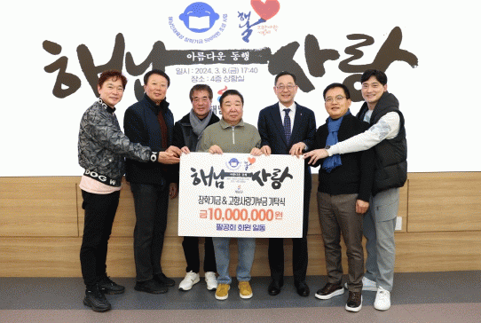 ±èÀåÈ£ ȸÀåÀ» ´ëÇ¥·Î °íÇâ»ç¶û±âºÎÁ¦¿Í ÀåÇлç¾÷±â±ÝÀ» °¢ 500¸¸¿ø¾¿, ÃÑ 1,000¸¸¿øÀ» ±âŹÇÑ Âü¼®ÀÚµéÀº ¡°¾Æ¸§´Ù¿î ÀÚ¿¬È¯°æÀ» ¹è°æÀ¸·Î ¿îµ¿À» Áñ±â±â À§ÇØ ¹æ¹®Çߴµ¥, À̹ø¿¡ ÇØ³²±º¿¡¼ °íÇâ»ç¶û±âºÎÁ¦ È®»ê°ú ÀåÇлç¾÷±â±Ý 500¾ï¿ø Á¶¼ºÀ̶ó´Â ¶æ±íÀº ÇÁ·ÎÁ§Æ®°¡ ÁøÇà ÁßÀÓÀ» ¾Ë°Ô µÇ¾î ±âºÎ¸¦ ¸¶À½¸Ô°Ô µÆ´Ù¡±¸ç ¡°À̹ø ±âºÎ±ÝÀÌ ÇØ³²±º¿¡¼ ¼öÇÐ ÁßÀÎ ¾ÆÀ̵éÀÌ ¿©·¯ ºÐ¾ßÀÇ ÀÎÀç·Î ÀÚ¶ó´Â µ¥¿¡ ¾²À̱⸦ ¹Ù¶õ´Ù.¡±´Â ¼Ò°¨À» ÀüÇß´Ù.