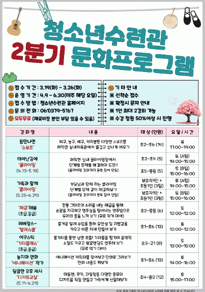 ¿ì¸® Áö¿ª¿¡¼ û¼Ò³âµéÀÇ °Ç°ÇÏ°í ±ÕÇü ÀÖ´Â ¼ºÀåÀ» À§ÇØ ÁøÇàµÇ´Â ¹®ÈÇÁ·Î±×·¥Àº û¼Ò³â¼ö·Ã°ü ÀÌ¿ëÀÚÀÇ ´Ù¾çÇÑ ÀǰßÀ» ¹Ý¿µÇØ Ã»¼Ò³â°ú ±× °¡Á·À» ´ë»óÀ¸·Î ¹®È¡¤¿¹¼ú¡¤¿ä¸®¡¤½ºÆ÷Ã÷ µî 8°³ °Á¸¦ ÁøÇàÇÑ´Ù.
