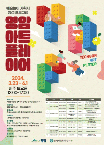 À̹ø ±³À°Àº ¿À´Â 3¿ù 23ÀϺÎÅÍ 6¿ù 1ÀϱîÁö ¸ÅÁÖ Åä¿äÀÏ ¿ÀÈÄ1½ÃºÎÅÍ 5½Ã±îÁö 4½Ã°£ ÃÑ 10ȸÂ÷·Î ÁøÇàµÇ¸ç ¡ã¿¹¼úÀÇ °ø°£°ú ³îÀÌ ¡ãÁö¿ªÁÖ¹ÎÀÌ ¸¸µé¾î°¡´Â ¹®È¿¹¼ú±³À° ¡ã¿¹¼ú ÇÁ·Î±×·¥ »ç·Ê °øÀ¯ ¡ãÇÁ·Î±×·¥ ÄÁ¼³ÆÃ ¡ã¿µ¾Ï ¿¹¼ú³îÀÌ Å°¿öµå ¹ß±¼ ¡ã¿¹¼ú³îÀÌ ÆÄÀÏ·µ µîÀÇ ÇÁ·Î±×·¥À¸·Î ¿î¿µµÉ ¿¹Á¤ÀÌ´Ù.