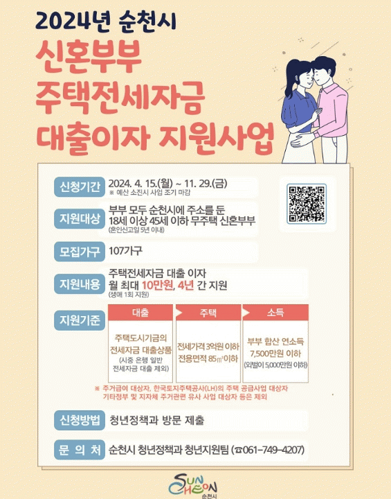 ½ÅÈ¥ºÎºÎ ÁÖÅÃÀü¼¼ÀÚ±Ý ´ëÃâÀÌÀÚ Áö¿ø»ç¾÷Àº ¼øÃµ½Ã¿¡ °ÅÁÖÇÏ´Â ¹«ÁÖÅà ½ÅÈ¥ºÎºÎ¿¡°Ô Àü¼¼ÀÚ±Ý ´ëÃâÀÌÀÚ¸¦ ¿ù 10¸¸¿ø¾¿ ÃÖ´ë 4³â°£ Áö¿øÇÏ´Â »ç¾÷ÀÌ´Ù.