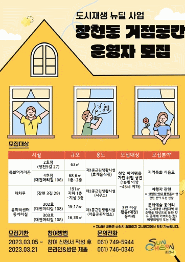 ½Åû¹æ¹ýÀº ¼øÃµ½ÃȨÆäÀÌÁö °í½Ã¡¤°ø°í¶õ¿¡ °Ô½ÃµÈ ±¸ºñ¼·ù¸¦ °®Ãß¾î µµ½Ã°ø°£Àç»ý°ú ¶Ç´Â ÀåõÇöÀåÁö¿ø¼¾ÅÍ¿¡ ¹æ¹®ÇÏ¿© ½ÅûÇϰųª ÀüÀÚ¿ìÆíÀ» ÅëÇØ °¡´ÉÇϸç, 1Â÷ ¼·ù½É»ç¿Í 2Â÷ ¸éÁ¢½É»ç¸¦ ÅëÇØ ÃÖÁ¾ ¿î¿µÀÚ°¡ ¼±Á¤µÈ´Ù.
