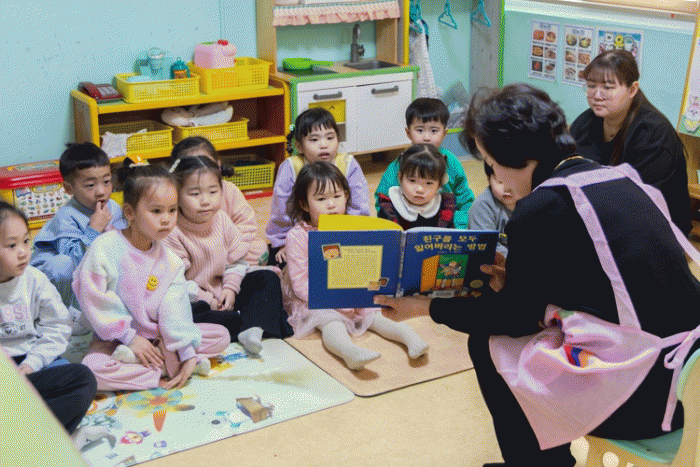 Áö³ 12ÀÏ ¿ÀÈÄ 1½Ã, ¿µ¾Ï±º ´öÁø¸é ¿ùÃâ¾î¸°ÀÌÁý ¡®Æä°¡¼ö½º¡¯¹Ý dz°æÀÌ´Ù. 7¼¼ ¾ÆÀ̵é 9¸íÀÌ °øºÎÇÏ´Â ¼ö¾÷ÀÌ ¿©´À ¶§¿Í ´Ù¸¥ Á¡Àº, ±×¸²Ã¥ '°õ ¾ÆÀú¾¾¿¡°Ô ¹°¾îº¸·Å'À» ÀоîÁÖ´Â À̰¡ ¾î¸°ÀÌÁý ¼±»ý´ÔÀÌ ¾Æ´Ï¶ó´Â °Í.