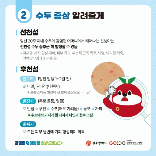 ¼öµÎ´Â ¿¹¹æÁ¢Á¾À» ÅëÇØ °¨¿°À» »çÀü¿¡ ¸·À» ¼ö ÀÖÀ¸¸ç, °¨¿°ÀÌ µÇ´õ¶óµµ °¡º±°Ô ¾Î°í Áö³ª°¥ ¼ö ÀÖÀ¸¹Ç·Î ¿µ¡¤À¯¾Æ º¸È£ÀÚ´Â »ýÈÄ 12~15°³¿ù¿¡ ¿¹¹æÁ¢Á¾À» ³õÄ¡Áö ¾Ê´Â °ÍÀÌ Áß¿äÇÏ´Ù. ¿¹¹æÁ¢Á¾ ½Ã±â¸¦ ³õÃÆ´Ù¸é °¡±î¿î ÁöÁ¤ À§Å¹ÀÇ·á±â°ü¿¡ ¹æ¹®ÇØ Á¢Á¾À» ¿Ï·áÇÏ´Â °ÍÀÌ ÇÊ¿äÇÏ´Ù.