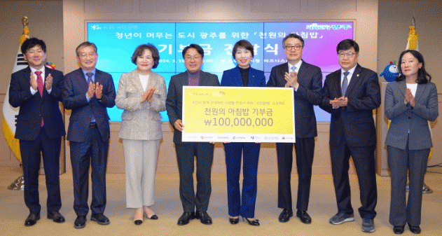 °±âÁ¤ ±¤ÁÖ½ÃÀåÀº ¡°ÇлýµéÀÇ µçµçÇÑ Ãµ¿øÀǾÆÄ§¹ä »ç¾÷ Áö¿øÀ» À§ÇØ ³ª¼ÁØ KB±ÝÀ¶±×·ì¿¡ Áø½ÉÀ¸·Î °¨»çµå¸°´Ù¡±¸ç ¡°KB±ÝÀ¶±×·ì°ú Á¤ºÎ¡¤±¤ÁֽᤴëÇÐÀÌ ½Ê½ÃÀÏ¹Ý Ãµ¿ø Çѳ¢ ¹ä»óÀ» Â÷¸° ¸¸Å ¿ì¸® ÇлýµéÀÌ ¹Ì·¡ÀÇ µ¿·ÂÀ¸·Î °Ç°ÇÏ°Ô ¼ºÀåÇϴµ¥ ÀÛÀº µµ¿òÀÌ µÇ±æ ¹Ù¶õ´Ù¡±°í ¹àÇû´Ù.