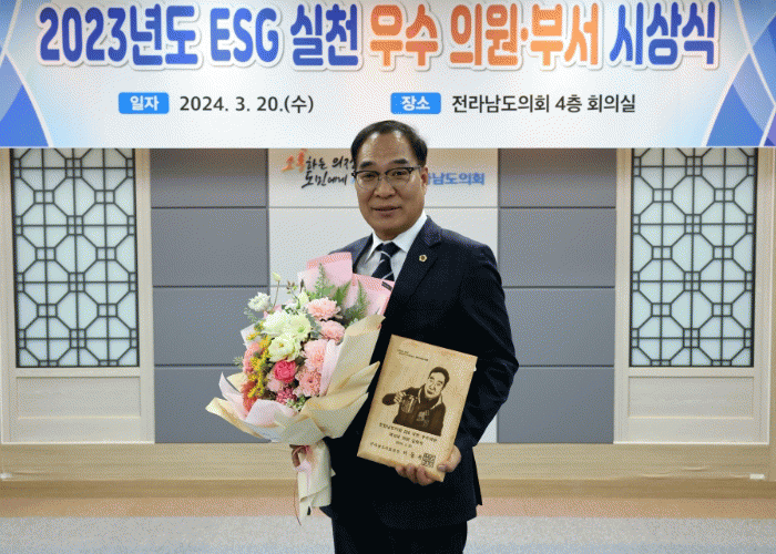 ¡®ESG ÃßÁø ¿ì¼öÀÇ¿ø¡¯Àº Àü¶ó³²µµÀÇȸ°¡ ÀÇÁ¤¿¡ °É¸ÂÀº ESG ½Ã½ºÅÛ ±â¹ÝÀ» ¸¶·ÃÇϰí, ESG ½Çõ ¹× ÀÎ½Ä È®»ê¿¡ ¾ÕÀå¼°íÀÚ ¸ð¹üÀÌ µÈ ¿ì¼ö ÀÇ¿ø¿¡°Ô ¼ö¿©ÇÏ´Â »óÀÌ´Ù.