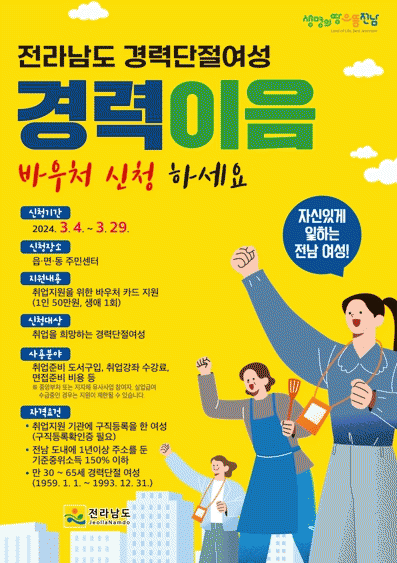 ½ÅûÀÏ ±âÁØ Àü³²¿¡ 1³â ÀÌ»ó ÁÖ¼Ò¸¦ µÎ°í, Ãë¾÷ Áö¿ø±â°ü¿¡ ±¸Á÷À» µî·ÏÇÑ 30~65¼¼(1959³â»ý~1993³â»ý)·Î, ÀçÃë¾÷À» ¹Ù¶ó´Â ÁßÀ§¼Òµæ 150% ÀÌÇÏ °æ·Â ´ÜÀý ¿©¼ºÀ» ´ë»óÀ¸·Î Áö¿øÇÑ´Ù.