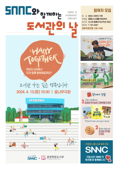 À̹ø Çà»ç´Â Á¦60ȸ µµ¼°üÁÖ°£(4¿ù 12ÀÏ~18ÀÏ)À» ¸Â¾Æ Áö¿ª ´ëÇ¥ ±â¾÷ÀÎ SNNC¿Í ÇÔ²² ¸¶·ÃÇßÀ¸¸ç, Çà»ç´Â ±×¸²Ã¥ ÀоîÁÖ±â, ½Ã¹Îµé¿¡°Ô SNNC ¾Ë¸®±â, ±è°æÈñ ±×¸²Ã¥ ÀÛ°¡ÀÇ °¿¬°ú 1À뱯 °ø¿¬, µ¿±Ø °ø¿¬, ±â³äǰ ÁõÁ¤ µîÀÇ ÇÁ·Î±×·¥À¸·Î ±¸¼ºµÈ´Ù.
