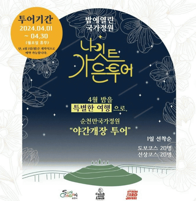 ¾ß°£Åõ¾î¿¡´Â Àü¹® ÇØ¼³»ç°¡ µ¿ÇàÇÏ¿© ¸®´º¾óµÈ ½Ã¼³ ¹× °¢Á¾ Å׸¶ Á¤¿ø¿¡ ´ëÇØ »ó¼¼ÇÑ ¼³¸íÀ» Á¦°øÇϰí, ¼øÃµ¸¸±¹°¡Á¤¿øÀÇ È·ÁÇÑ ¾ß°£°æ°üÀ» ÇÑÃþ ´õ ±íÀÌ ÀÖ°Ô °ü¶÷ÇÒ ¼ö ÀÖµµ·Ï ÁغñÇß´Ù.