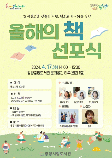 2010³â ½ÃÀÛÇØ ¿ÃÇØ·Î 15ȸ°¸¦ ¸Â´Â ¡®±¤¾ç½Ã ¿ÃÇØÀÇ Ã¥¡¯ »ç¾÷Àº ±¹³»¿Ü¿¡¼ Ȱ¹ßÇÏ°Ô ÆîÃÄÁö°í ÀÖ´Â Áö¿ª»çȸ ´ëÁß µ¶¼¿îµ¿ ¡®ÇÑ Ã¥, ÇÑ µµ½Ã(One Book One City)¡¯ ¿îµ¿ÀÇ Çϳª·Î ½Ã¹Î µ¶¼¹®È Á¤Âø°ú Ã¥ Àд »çȸ ºÐÀ§±â Á¶¼ºÀ» À§ÇÑ µ¶¼ÁøÈï ¿îµ¿ÀÌ´Ù.