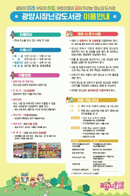 ÀÌ¿ë ´ë»óÀº ±¤¾ç½Ã¿¡ ÁÖ¼ÒÁö¸¦ µÎ°í °ÅÁÖÇÏ´Â ÃëÇÐ Àü ¾Æµ¿À̸ç, ºÎ¸ð ¶Ç´Â º¸È£ÀÚ°¡ ȸ¿ø°¡ÀÔÇÑ ÈÄ ÀÌ¿ëÇÒ ¼ö ÀÖ´Ù. ¿¬È¸ºñ 1¸¸2õ¿øÀ» ³»¸é Àå³°¨À» 1ȸ´ç 2Á¡, 14Àϰ£(¿¬Àå¾øÀ½) ´ë¿©ÇÒ ¼ö ÀÖ´Ù.