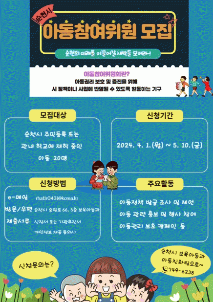 ¸ðÁý´ë»óÀº ¼øÃµ½Ã¿¡ Áֹεî·ÏÀÌ µÇ¾î Àְųª °ü³» Çб³¿¡ ´Ù´Ï°í ÀÖ´Â 18¼¼ ¹Ì¸¸ÀÇ ¾Æµ¿ÀÌ´Ù. Âü¿©¸¦ Èñ¸ÁÇÏ´Â ¾Æµ¿Àº 5¿ù 10ÀϱîÁö º¸À°¾Æµ¿°ú·Î ½ÅûÇÏ¸é µÈ´Ù. ´õ ÀÚ¼¼ÇÑ ¸ðÁý¾È³» ¹× ½Åû¹æ¹ýÀº ¼øÃµ½Ã ´©¸®ÁýÀ» Âü°íÇÏ¸é µÈ´Ù.