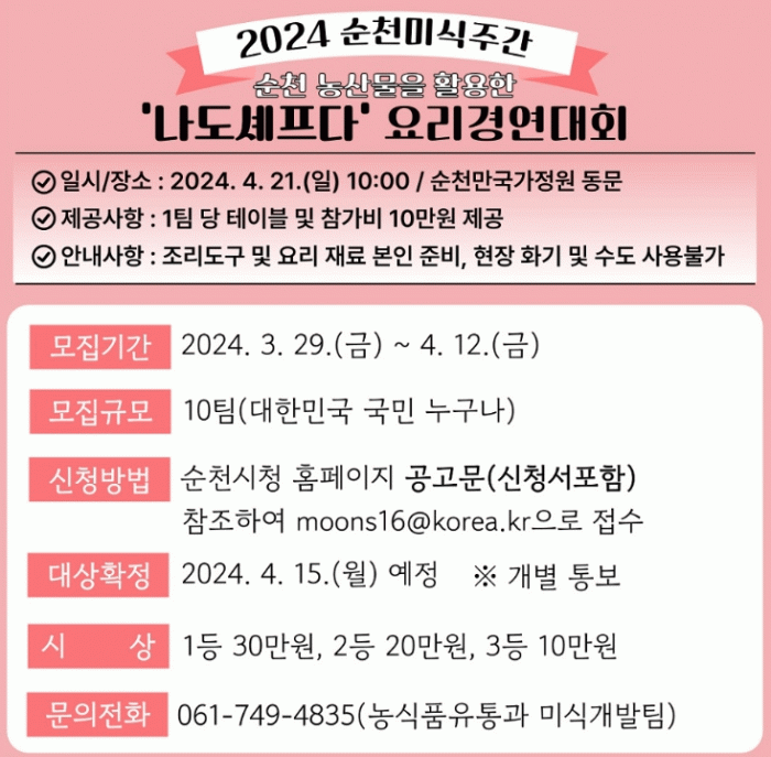 Âü°¡±Ô¸ð´Â 10ÆÀÀ¸·Î ¼øÃµ½Ã¹Î ¹× ±¹°¡Á¤¿øÀ» ã´Â °ü±¤°´ µî ´©±¸³ª Âü¿©ÇÒ ¼ö ÀÖÀ¸¸ç ¼±Âø¼ø¿¡ ÀÇÇØ Âü°¡ÀÚ°¡ È®Á¤µÇ°í, 4¿ù 21ÀÏ ¼øÃµ¸¸±¹°¡Á¤¿ø µ¿¹®'2024 ¼øÃµ¹Ì½ÄÁÖ°£'Çà»çÀå ³»¿¡¼ ÇöÀå °æ¿¬À» ÅëÇØ ¼ö»óÀÚ°¡ °áÁ¤µÈ´Ù.