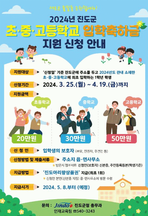 Áö¿ø´ë»óÀº ½ÅûÀÏ ±âÁØ Áøµµ±º¿¡ ÁÖ¼Ò¸¦ µÎ°í °ü³» ¼ÒÀçÇÑ ÃÊ¡¤Áß¡¤°íµîÇб³¿¡ ÃÖÃÊ ÀÔÇÐÇÏ´Â 1Çгâ ÇлýÀ¸·Î ¡ãÃʵîÇб³ 20¸¸¿ø ¡ãÁßÇб³ 30¸¸¿ø ¡ã°íµîÇб³ 50¸¸¿øÀ» Áö¿øÇÑ´Ù.