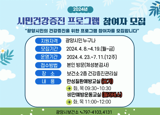 ÇÁ·Î±×·¥ Âü¿©¸¦ ¿øÇÏ´Â ½Ã¹ÎÀº ¿À´Â 8ÀÏ ºÎÅÍ 19ÀϱîÁö ±¤¾ç½Ãº¸°Ç¼Ò(2Ãþ) °Ç°ÁõÁø½Ç·Î ¹æ¹® ½ÅûÇÏ¸é µÈ´Ù.