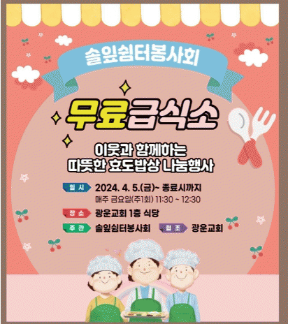 4ÀÏ ºÏ±¸¿¡ µû¸£¸é ÀÌ´ÞºÎÅÍ ¿î¾Ïµ¿¿¡ ¼ÒÀçÇÑ ¡®±¤¿î±³È¸(´ãÀÓ¸ñ»ç À̳²±Ô)¡¯¿¡¼ ¹Î°£ ÈÄ¿øÀ» ±â¹ÝÀ¸·Î ÇÑ ¡®¼ÖÀÙ½°ÅͺÀ»çȸ ÁÖ°ü ¹«·á ±Þ½Ä¼Ò¡¯ ¿î¿µÀÌ °³½ÃµÈ´Ù.
