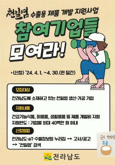Àü³²¿¡¼ »ý»êÇϴ õÀÏ¿°Àº Àü±¹ÀÇ 92%¿¡ ÇØ´çÇÏ´Â ¿¬°£ 22¸¸ 3õ ÅæÀÌ´Ù. Áö³ÇØ ÃµÀÏ¿° ¼öÃâÀº 1õ671Åæ, 156¸¸ 4õ ´Þ·¯·Î, ±¹³» ¼ö¿ä¸¦ ³Ñ¾î ÇØ¿Ü½ÃÀå¿¡¼ Â÷º°ÈµÈ ¼Ò±ÝÀ¸·Î¼ ºÎ°¡°¡Ä¡¸¦ ³ôÀ̱â À§ÇØ ³ë·ÂÇϰí ÀÖ´Ù. ¹Ì³×¶ö µî ¿µ¾çºÐÀÌ Ç³ºÎÇÑ Àü³² õÀÏ¿°À» °íºÎ°¡°¡Ä¡ °¡°øÇ°À¸·Î »ý»êÇϵµ·Ï »óǰ ¿ë±â¡¤Æ÷Àå °³¹ß, ǰÁúÀÎÁõ, ¾ÈÀü¼º °Ë»ç¸¦ ½Ç½ÃÇϰí, ¹Ú¶÷ȸ Âü°¡³ª ¼öÃâÀ» À§ÇÑ ¹ÙÀ̾î ÃÊûÀ» Áö¿øÇÏ´Â ¼öÃâ Ȱ¼ºÈ Áö¿ø»ç¾÷µµ ÃßÁøÇϰí ÀÖ´Ù.