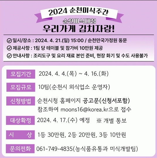 ¼ö»óÀÚ´Â 4¿ù 21ÀÏ ¿ÀÈÄ 3½Ã ¼øÃµ¸¸±¹°¡Á¤¿ø µ¿¹®'2024 ¼øÃµ¹Ì½ÄÁÖ°£'Çà»çÀå ³»¿¡¼ ÇöÀå °æ¿¬À» ÅëÇØ °áÁ¤µÈ´Ù.