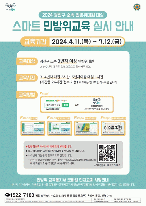 ±¤»ê±¸´Â ¿ÃÇØµµ ÀÌ·± ü°è·Î ±¸ ¼Ò¼Ó ¸ðµç ¹Î¹æÀ§´ë¿øÀ» ´ë»óÀ¸·Î ¹Î¹æÀ§ ±³À°À» ÁøÇàÇÑ´Ù. ¡â4¿ù 11ÀÏ~7¿ù 12ÀÏ ¡â8¿ù 12ÀÏ~9¿ù 27ÀÏ ¡â10¿ù 21ÀÏ~12¿ù 6ÀÏ µî ÃÑ 3ȸ¿¡ °ÉÃÄ ½ÃÇàÇÑ´Ù.