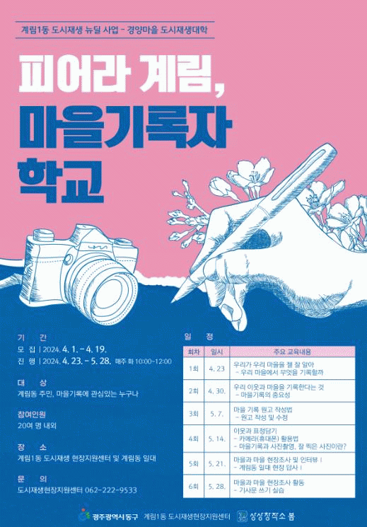 À̹ø ÇÁ·Î±×·¥Àº °è¸²1µ¿ ÁÖ¹ÎÀ» ºñ·ÔÇØ ¸¶À» ±â·Ï¿¡ °ü½É ÀÖ´Â µ¿±¸¹ÎÀ» ´ë»óÀ¸·Î ¿ø°í ÀÛ¼º¹ý, »çÁø ÃÔ¿µ, ÇöÀå Á¶»ç¿Í ÀÎÅÍºä ¹æ¹ý µîÀ» ¹è¿ì°í ÀÛ¼ºÇÑ ¿ø°í¸¦ Åä´ë·Î ÇÑ ¸¶À»½Å¹® ¹ßÇàÀ» ¸ñÇ¥·Î ÇÑ´Ù.