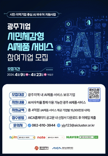 ±¤ÁÖ±¤¿ª½Ã´Â ÀΰøÁö´É±â¼úÀÇ ½Ã¹Î ü°¨ È®´ë¿Í Áö¿ª ÀΰøÁö´É±â¾÷ÀÇ ¼ºÀå ÃËÁøÀ» À§ÇØ ¡®½Ã¹Î¡¤Áö¿ª±â¾÷ Á᫐ AI ¹Ù¿ìó Áö¿ø»ç¾÷¡¯¿¡ Âü¿©ÇÒ ±â¾÷ 20¿©°÷À» ¿À´Â 23ÀϱîÁö ¸ðÁýÇÑ´Ù.
