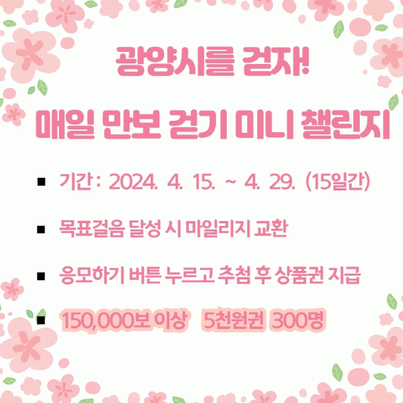 Âü¿© ¹æ¹ýÀº ¿öÅ©¿Â¿¡¼ ¡®±¤¾ç½Ã °ø½Ä Ä¿¹Â´ÏƼ¡¯¿¡ °¡ÀÔÇϰí 縰Áö ÅÇ¿¡¼ ±¤¾ç½Ã °È±â 縰Áö ¡®Âü¿©Çϱ⡯¸¦ ´©¸¥ ÈÄ ¸ñÇ¥ ¸¶Àϸ®Áö°¡ ½×ÀÏ ¶§±îÁö ½º¸¶Æ®ÆùÀ» ¼ÒÁöÇÏ°í °ÉÀ¸¸é µÈ´Ù. ÇöÀç ±¤¾ç½Ã °ø½Ä Ä¿¹Â´ÏƼ ´©Àû Âü¿©ÀÚ´Â 8,731¸íÀÌ´Ù.
