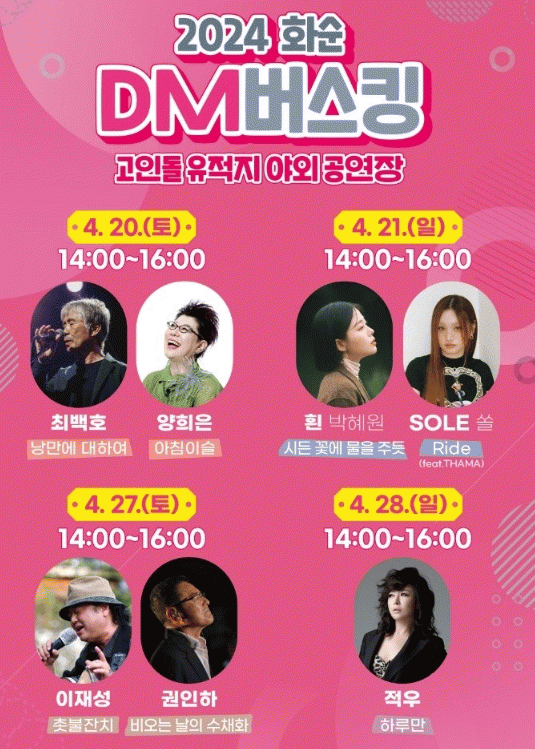 4¿ù 20ÀÏ¿¡´Â ¡®³¶¸¸¿¡ ´ëÇÏ¿©¡¯·Î À¯¸íÇÑ ÃÖ¹éÈ£¿Í ¡®¾ÆÄ§ À̽½¡¯ÀÇ ¾çÈñÀºÀÌ Ã⿬ÇÏ¿© 7080¼¼´ëÀÇ °¨¼ºÀ» ÀÚ±ØÇÒ ¿¹Á¤À̸ç, 4¿ù 21ÀÏ¿¡´Â ½ò(Sole)°ú Â÷¼¼´ë ¹ß¶óµå ¿©½ÅÀ¸·Î ºÒ¸®´Â ¹ÚÇý¿ø(HYNN)ÀÌ Ã⿬, ÃàÁ¦ÀåÀ» ãÀº °ü±¤°´¿¡°Ô ÇູÀ» ÀüÇÑ´Ù.