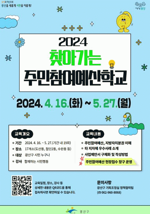 ã¾Æ°¡´Â ÁÖ¹ÎÂü¿©¿¹»êÇб³´Â ±¤»ê±¸ ½Ã¹Î ´©±¸³ª º°µµÀÇ ½Åû ÀýÂ÷ ¾øÀÌ Âü¿©ÇÒ ¼ö ÀÖÀ¸¸ç, ±¸Ã¼ÀûÀÎ ±³À° Àå¼Ò, ÀÏÁ¤Àº ¡®±¤»ê±¸ ÁÖ¹Îe(ÀÌ)Âü¿©¡¯, ¡®±¤»ê±¸ ÁÖ¹ÎÂü¿©¿¹»ê ´©¸®Áý¡¯ °øÁö »çÇ׿¡¼ È®ÀÎÇÒ ¼ö ÀÖ´Ù.