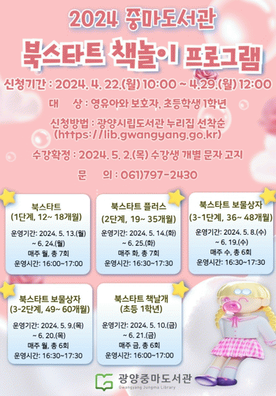 ¼ö°·á¿Í Àç·áºñ´Â ¹«·áÀ̸ç, ¼ö° ½ÅûÀº ¿À´Â 22ÀÏ ¿ÀÀü 10½ÃºÎÅÍ 29ÀÏ ³· 12½Ã±îÁö ±¤¾ç½Ã¸³µµ¼°ü ´©¸®ÁýÀ» ÅëÇØ ÇÒ ¼ö ÀÖ´Ù. 1´Ü°è~3´Ü°è´Â º¸È£ÀÚ ¶Ç´Â ¾ÆÀÌ À̸§À¸·Î ½Åû °¡´ÉÇϸç, Ã¥³¯°³(Ãʵî1Çгâ)´Â ¼ö°»ý À̸§(¾ÆÀ̵ð)À¸·Î ½ÅÃ»ÇØ¾ß ÇÑ´Ù.
