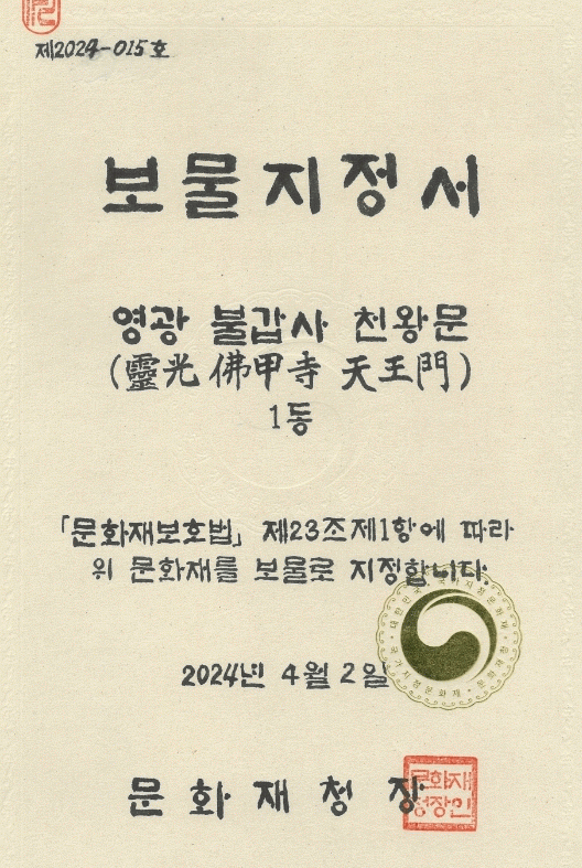 ¹®ÈÀçûÀº ¡®¿µ±¤ ºÒ°©»ç õ¿Õ¹®¡¯À» ºñ·ÔÇØ ÁÖ¿ä »çÂûÀÇ ±Ý°¹®(ÐÝ˧ڦ)°ú õ¿Õ¹®(ô¸èÝÚ¦), Ãæ³² ¼»ê ¹®¼ö»ç ±Ø¶ôº¸Àü µî 9°ÇÀ» º¸¹°·Î ÁöÁ¤Çß´Ù°í 2ÀÏ ¹àÇû´Ù.
