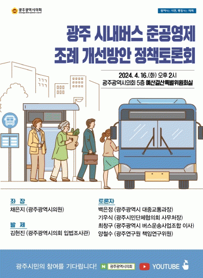 Àü¹®°¡ Åä·Ð¿¡´Â ¹éÀºÁ¤ ±¤Áֽà ´ëÁß±³Åë°úÀå, ±â¿ì½Ä ½Ã¹Î´ÜüÇùÀÇȸ »ç¹«Ã³Àå, ÃÖⱸ ±¤Áֽà ¹ö½º¿î¼Û»ç¾÷Á¶ÇÕ ÀÌ»ç, ¾çö¼ö ±¤ÁÖ¿¬±¸¿ø Ã¥ÀÓ¿¬±¸À§¿øÀÌ Âü¿©ÇÑ´Ù.