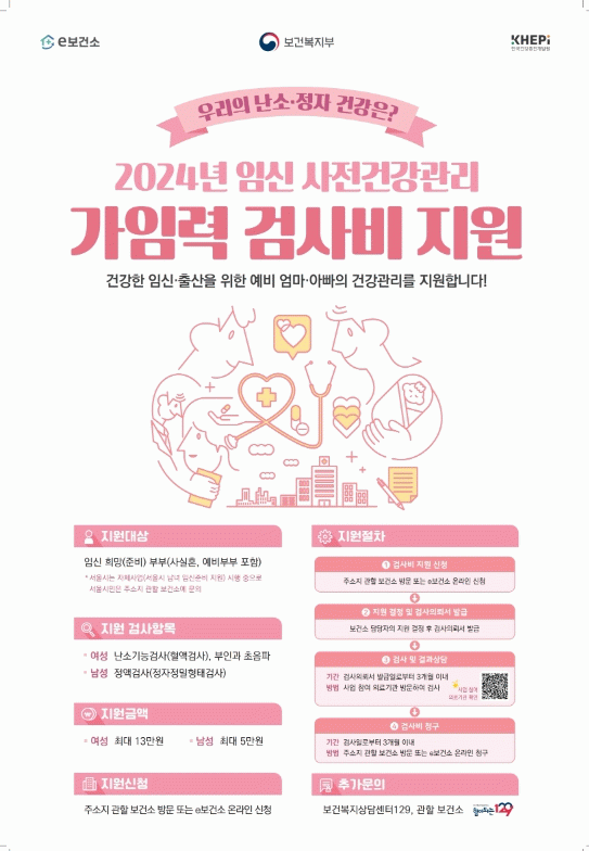 Áö¿ø ´ë»óÀº ÀÓ½ÅÀ» Èñ¸ÁÇϰųª °èȹÇϰí ÀÖ´Â ºÎºÎ(»ç½ÇÈ¥, ¿¹ºñºÎºÎ Æ÷ÇÔ)´Ù. ¿Â¶óÀÎ(eº¸°Ç¼Ò) ¶Ç´Â ÁÖ¼ÒÁö º¸°Ç¼Ò·Î ±¸ºñ¼·ù¸¦ °®Ãç »çÀü ½Åû ÈÄ ¹ß±Þ¹ÞÀº °Ë»çÀÇ·Ú¼¸¦ ÀÇ·á±â°ü¿¡ Á¦ÃâÇÏ°í °Ë»ç¸¦ ¹ÞÀ¸¸é µÈ´Ù.