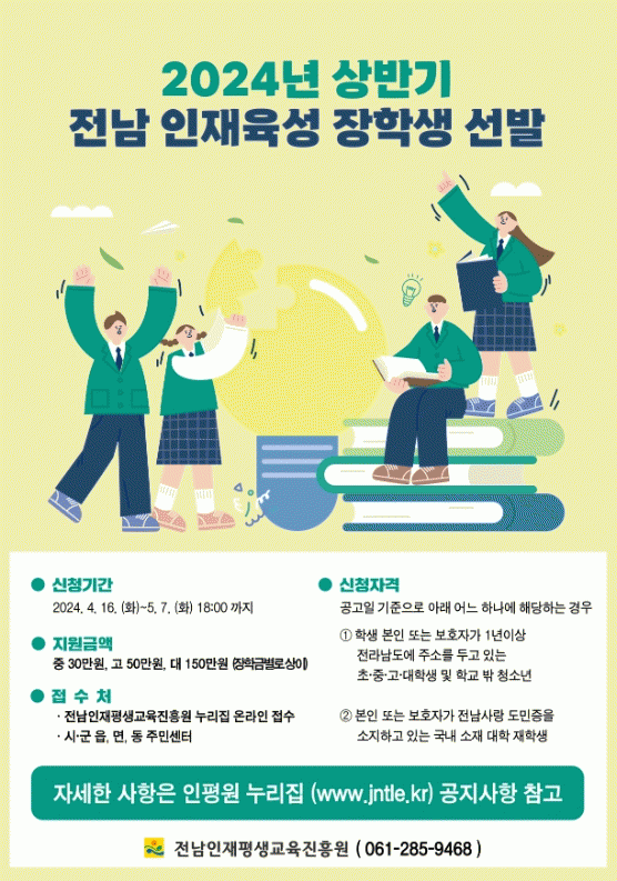 Àü³²ÀÎÀçÀ°¼º ÀåÇлý ¼±¹ßÀº (Àç)Àü³²ÀÎÀçÆò»ý±³À°ÁøÈï¿ø(ÀÌÇÏ ÁøÈï¿ø)¿¡¼ ¿î¿µÇϸç ÃÑ 3°³ ºÐ¾ß·Î ³ª´²Áø´Ù. ½Åû ÀÚ°ÝÀº Çлý º»ÀÎ ¶Ç´Â º¸È£ÀÚ(ºÎ ¶Ç´Â ¸ð)°¡ °ø°íÀÏ ÇöÀç 1³â ÀÌ»ó Àü³²µµ ³»¿¡ ÁÖ¼Ò¸¦ µÐ ÃʵîÇлýºÎÅÍ ´ëÇлýÀÌ´Ù. Àü³²»ç¶û µµ¹ÎÁõÀÌ ÀÖ´Â Çâ¿ìÀÇ ´ëÇлý Àڳ൵ Áö¿øÇÒ ¼ö ÀÖ´Ù.