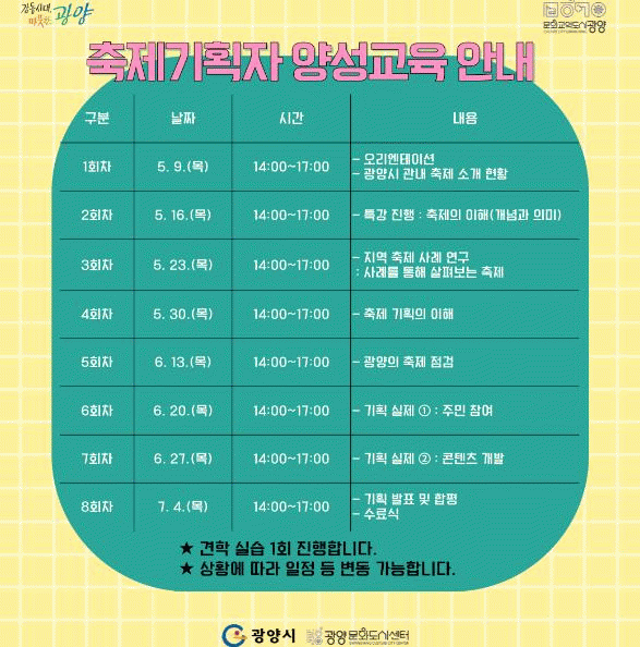 ±³À° Âü°¡ ½Åû ±â°£Àº 4¿ù 30ÀϱîÁö ¼½ÄÀ» ÀÛ¼ºÇØ À̸ÞÀÏ·Î ½Åû °¡´ÉÇϸç, ÀÚ¼¼ÇÑ ³»¿ëÀº ±¤¾ç¹®Èµµ½Ã¼¾ÅÍ·Î ¹®ÀÇÇÏ¸é µÈ´Ù.