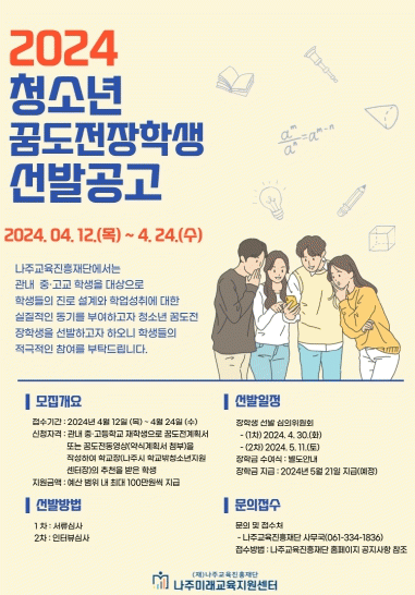 ³ªÁֽà Áß¡¤°íµîÇб³ ÀçÇлý(Çб³¹Û û¼Ò³â Æ÷ÇÔ)ÀÌ¸é ´©±¸³ª ½Åû °¡´ÉÇÏ´Ù. Çб³ÀåÀ̳ª ³ªÁÖ½ÃÇб³¹Ûû¼Ò³âÁö¿ø¼¾ÅÍÀåÀÇ ÃßõÀ» ¹Þ¾Æ ²ÞµµÀü °èȹ¼ ¶Ç´Â ²ÞµµÀü µ¿¿µ»ó µîÀ» ±¸ºñÇØ 24ÀϱîÁö ³ªÁÖ±³À°ÁøÈïÀç´Ü »ç¹«±¹À¸·Î Á¢¼öÇÏ¸é µÈ´Ù. ¿ìÆí ¶Ç´Â À̸ÞÀÏ ¸ðµÎ °¡´ÉÇÏ´Ù.
