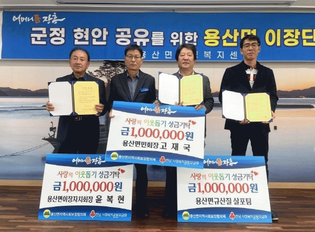 Áö³ 18ÀÏ ¿ë»ê¸é °íÀç±¹ ¸é¹ÎÀÇ Àå, ¿ë»ê¸é ±Ô»êÁú »ìÆ÷ÆÀ, ¿ë»ê¸é À±º¹Çö ÀÌÀåÀÚġȸÀå, µ¿¾ç³ó±â°è ÀÌÁ¾Àç ´ëÇ¥´Â ³ª´® ½ÇõÀ» À§ÇØ ¼º±Ý °¢ 1¹é¸¸ ¿øÀ» ¿ë»ê¸é Áö¿ª»çȸº¸ÀåÇùÀÇü¿¡ ±âÅ¹ÇØ ÀÌ¿ô »ç¶ûÀ» ½ÇõÇß´Ù.